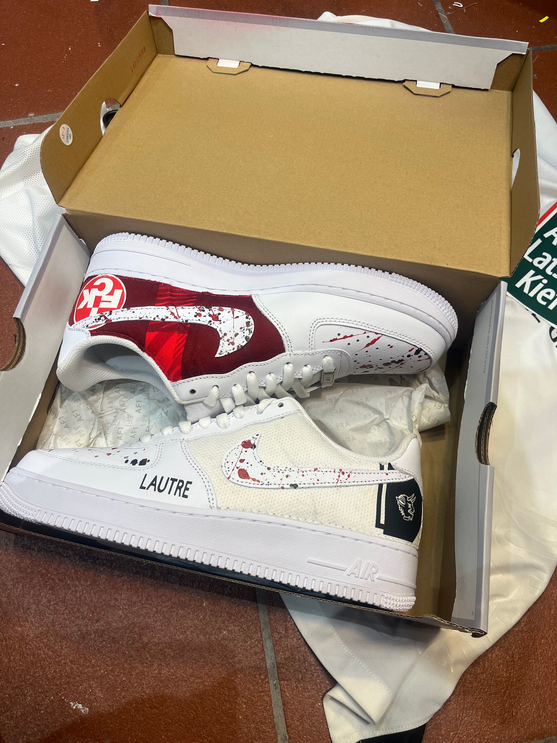 Custom shoes with your own jersey.Handmade from start to finish.Price includes the Nike Air Force 1 + the design.All you have to do is send us your jersey.Allow 14 - 18 days for shipping.